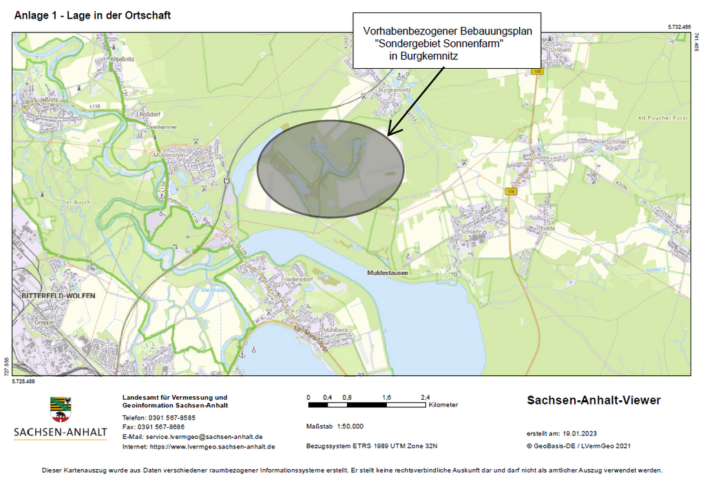Die Gemeinde Muldestausee beabsichtigt in der Gemarkung Burgkemnitz die Errichtung einer Photovoltaikanlage für einen Solarpark zu ermöglichen. Das Plangebiet mit den Teilbereichen I bis VI befindet sich innerhalb der Gemeinde Muldestausee, zwischen den Ortschaften Muldenstein, Schlaitz, Burgkemnitz und nördlich des Muldestausees.